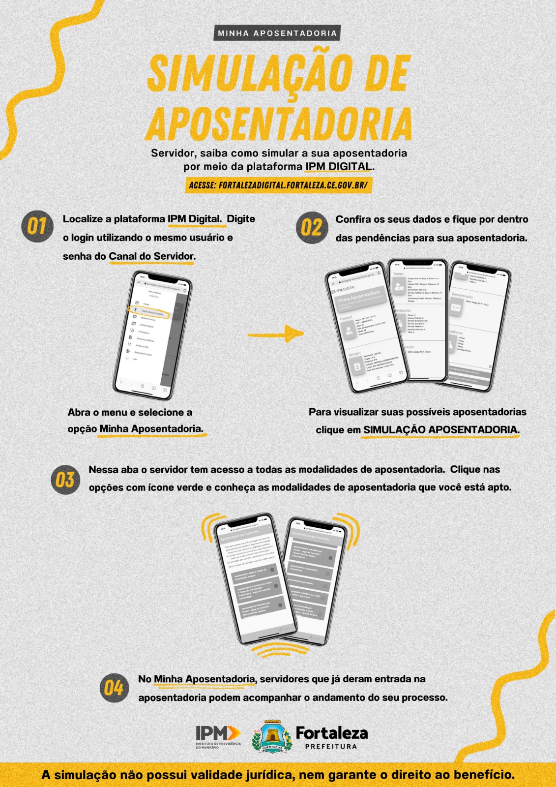 O Instituto de Previdência do Município (IPM), está habilitando um novo serviço para servidores efetivos do Município de Fortaleza simularem sua aposentadoria no próprio celular ou de qualquer computador, sem precisarem se deslocar até a sede do IPM.